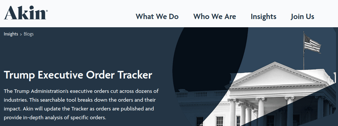Akin is a large international law firm and their Trump Executive Order Tracker interprets executive orders through the legal lens. They summarize each executive order, describe their impacts, and offer occasional legal analysis. Their summaries are often short and sweet; for example, their description of the executive order regarding prescription drug prices is approximately a two-minute read. They have an overview as well, which parses each executive order down to a single paragraph-long description. If you’re looking for somewhere to find a quick understanding of executive orders as they’re published, Akin is a good way to go.